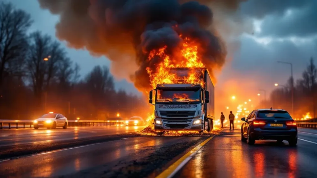 - Brandende vrachtwagen: De vrachtwagen vatte vlam, wat leidde tot gevaarlijke situaties.